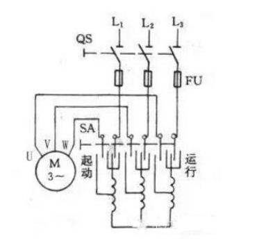 起動(dòng)時(shí),將轉(zhuǎn)換開關(guān)SA擰到“啟動(dòng)”位置,此時(shí)電機(jī)定子繞組與自耦變壓器的低壓側(cè)連接,電動(dòng)機(jī)降壓?jiǎn)?dòng),待轉(zhuǎn)速上升到一定值時(shí),再將SA擰緊,電機(jī)定子繞組與自耦變壓器的低壓側(cè)連接,電機(jī)定子繞組啟動(dòng)。