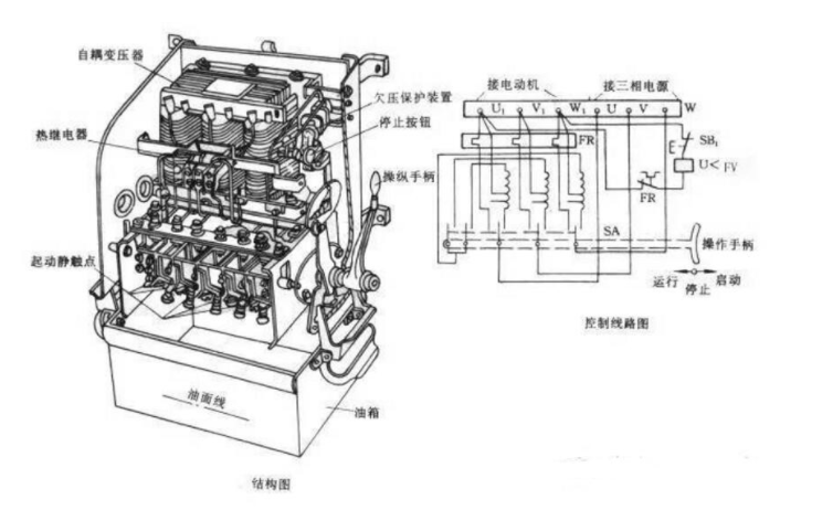 采用手動(dòng)控制的補(bǔ)償器主要有QJ3。QJ3型起動(dòng)補(bǔ)償器結(jié)構(gòu)圖和控制線路圖如下: